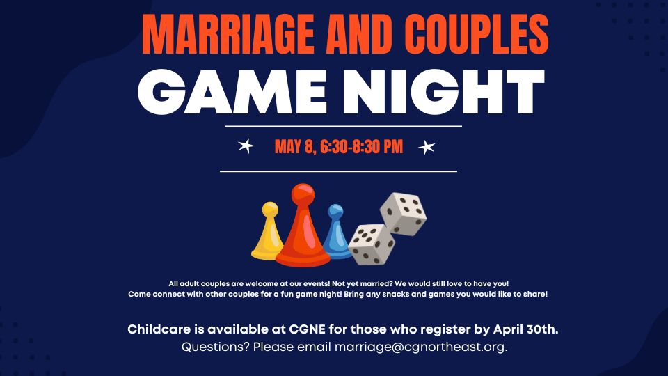 All adult couples are welcome at our events! Not yet married? We would still love to have you! Come connect with other couples for a fun game night! Bring any snacks and games you would like to share! Childcare is available at CGNE for those who register by April 30th. Questions? Please email marriage@cgnortheast.org.